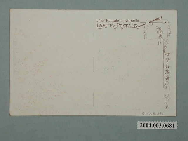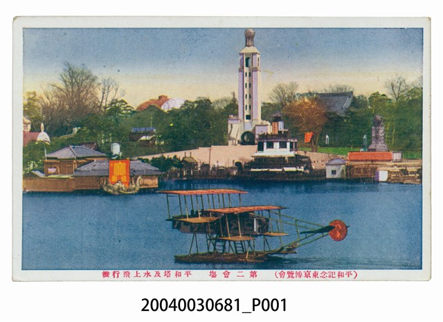 1.本物件為以平和記念東京博覽會,平和塔與水上飛機為主題之明信片,正面為平和塔與水上飛機彩色圖像,畫面中可見1架木製飛機浮於池上,後方處則有1純白塔矗立,下方有1段文字「(平和紀念東京博覽會)第二會場平和塔及水上飛機」;背面為空白明信片直式書寫面,以黑色單色印刷,左上處為郵票黏貼處,為1畫板樣式,有2支筆刷,其下方有「MADE IN JAPAN」字樣,上方有「郵便はかき」字樣,左側有「union Postale universelle」、「CARTE POSTALE」2行字樣。2.平和紀念東京博覽會舉辦於西元1922年3月10日至7月31日,為紀念第一次世界大戰的結束,並慶賀一戰後產業的復甦,花費600萬圓,耗費3年時間,選定於東京上野公園及鄰近的不忍池畔舉行。水上飛行機行駛地點位於第二會場,其啟程地點與龍宮館相鄰,為1架於水上滑行的飛機,可坐18人,搭乘費用小孩50錢,大人60錢。