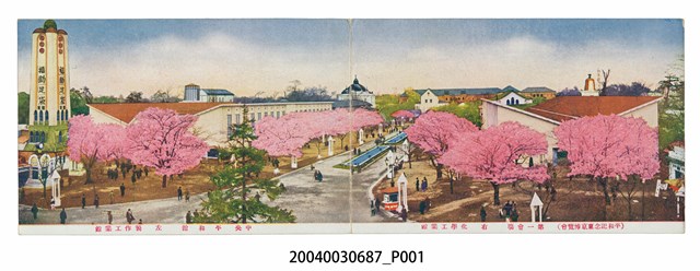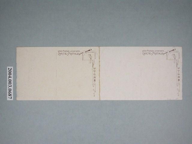 1.本物件為以平和記念東京博覽會,化學工業館、平和館、製作工業館為主題之2張明信片,正面為2張明信片合起來之化學工業館、平和館、製作工業館彩色圖像,畫面中可見右方之化學工業館,中央之平和館,左側之製作工業館,街道上開滿了櫻花樹,且有數量頗多的民眾於會場內參觀,下方有1段文字「(平和記念東京博覽會)第一會場右化學工業館中央平和館左製作工業館」;背面為2張空白明信片直式書寫面,此2張明信片之格式皆相同,以黑色單色印刷,左上處為郵票黏貼處,為1畫板樣式,有2支筆刷,其下方有「MADE IN JAPAN」字樣,上方有「郵便はかき」字樣,左側有「union Postale universelle」、「CARTE POSTALE」2行字樣。2.平和紀念東京博覽會舉辦於西元1922年3月10日至7月31日,為紀念第一次世界大戰的結束,並慶賀一戰後產業的復甦,花費600萬圓,耗費3年時間,選定於東京上野公園及鄰近的不忍池畔舉行。化學工業館位於第一會場,展覽內容為各式現代化學工業製品,如化學藥品、精油、香料化妝品、肥皂等。平和館位於第一會場,建築形式為新式建築,館前有新海作太郎雕刻的和平女神和天使像,為各種大會舉行之所。製作工業館位於第一會場為凹字形建築,展示內容為各式金屬製品、皮革、珠寶加工、文具、玩具等日常生活所需物品。