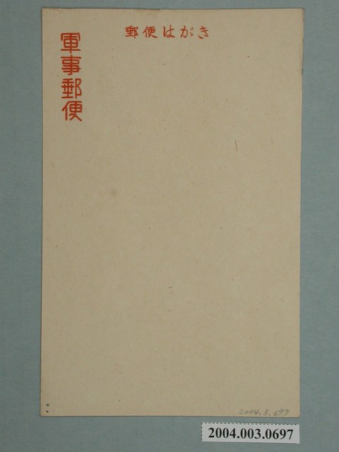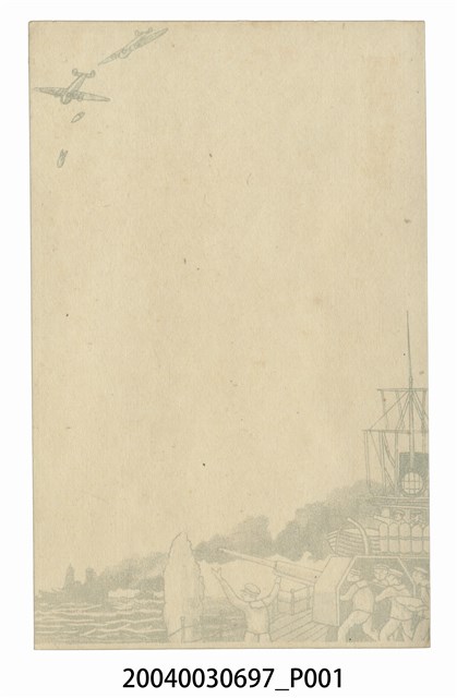 1.本物件為以軍事郵便為主題之明信片,正面為戰爭畫面,右下有於戰艦上進行攻擊之海軍圖像,左上則有戰鬥機正在進行飛彈投擲;背面為空白明信片直式書寫面,以橘色單色印刷,上方有「郵便はがき」字樣,左上有「軍事郵便」字樣。2.軍事郵便為服務戰場上士兵的郵政系統,戰場上寄出之郵件經由野戰郵局之處理,送達目的地,軍事郵便於二戰中被廣為使用,而日本方面則是於西元1894年時即以勅令方式公告軍事郵便的相關事宜,包括軍人與其眷屬不須負擔郵便費用等,另有其他如信件內容、郵票等規範。