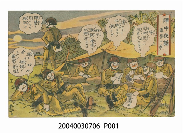 1.本物件為以日本二戰時期戰爭漫畫為主題之明信片,正面為露營之情景彩色圖像,畫面中可見8名士兵於同一營地休息,右下士兵拿有1慰問袋,於帳棚內之4名士兵正在閱讀或是書寫紙張,左下2名士兵正在睡覺,左上士兵正在賞月,圖中對話大意為士兵展示其慰問袋裡的菸草,亦有士兵記錄戰爭情形欲使故鄉的家人知情,也有士兵讚賞戰場的月亮特別不一樣,亦有士兵在哼歌,右上有標題「陣中夜話露營の夢」字樣,左下有「秋風」字樣;背面為空白明信片直式書寫面,以灰色單色印刷,左上方為郵票黏貼處,以1星形圖樣標示,正方有「郵便はがき」,正中間則有「(東京武揚堂發行)」字樣。2.二次世界大戰為西元1937年至1945年全球性戰爭,該次戰爭因軍事設備提升,連帶造成各國死傷慘重,1937年蘆溝橋事變則為二戰亞洲戰場之開端。日本為軸心國陣營,於戰爭中積極侵略中國等地,1941年發動珍珠港事變,進而爆發太平洋戰爭,最後美國於1945年8月投下2顆原子彈,致使日本無條件投降,結束戰爭。