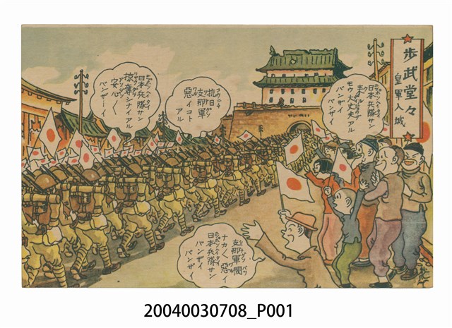 1.本物件為以日本二戰時期戰爭漫畫為主題之明信片,正面為日本軍進城之彩色圖像,畫面中可見日本軍隊正在進入中國某處城中,前方有1座中國式城門,兩旁之民眾皆表示歡迎,揮舞著日本太陽旗,圖中對話大意為支持日本軍隊打敗萬惡的中國軍閥,且日本軍隊不會掠奪民眾,右上有標題「步武堂々皇軍入城」字樣,右下有「秋風」字樣;背面為空白明信片直式書寫面,以灰色單色印刷,左上方為郵票黏貼處,以1星形圖樣標示,正方有「郵便はがき」,正中間則有「(東京武揚堂發行)」字樣。2.二次世界大戰為西元1937年至1945年全球性戰爭,該次戰爭因軍事設備提升,連帶造成各國死傷慘重,1937年蘆溝橋事變則為二戰亞洲戰場之開端。日本為軸心國陣營,於戰爭中積極侵略中國等地,1941年發動珍珠港事變,進而爆發太平洋戰爭,最後美國於1945年8月投下2顆原子彈,致使日本無條件投降,結束戰爭。