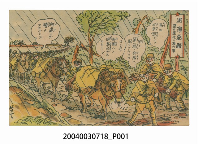 1.本物件為以日本二戰時期戰爭漫畫為主題之明信片,其正面為泥濘惡路 連日趕程的強行軍彩色繪圖,畫面中可見正下著雨,馬匹揹有大批物資,前有一人牽著韁繩,龐大的隊伍在雨中踩著泥濘持續向前,對話中可見士兵們覺得馬匹十分辛苦,讓軍隊快速到達前線,連日趕程亦是對國家的付出,明信片右上有標題「泥濘惡路 連日連夜の強行軍」字樣;背面為空白明信片直式書寫面,以灰色單色印刷,左上方為郵票黏貼處,以一星形圖樣標示,正方有「郵便はがき」,正中間則有「(東京武揚堂發行)」字樣。
