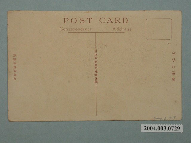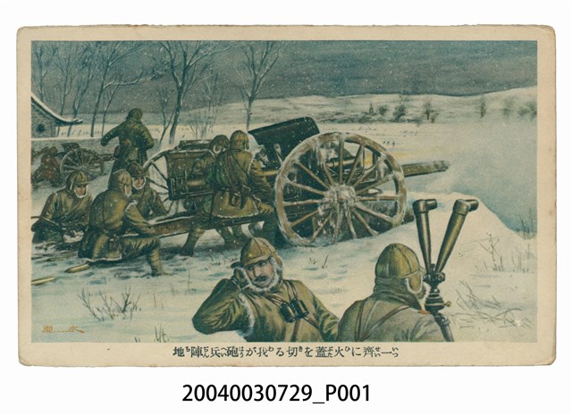 1.本物件為以九一八事變為主題之明信片,其正面為日軍砲兵開始戰鬥彩色繪圖,畫面中可見氣候嚴寒,雪地之中有數名日本軍人協力準備砲彈射擊,近景則為兩名軍人持望遠鏡觀察敵情,右側遠景可見煙硝瀰漫,明信片下方有「一齊に火蓋を切る我が砲兵陣地」字樣,意即我方陣營同時開火,背面為空白明信片橫式書寫面,以紅褐色單色印刷,右上方為郵票黏貼處,右側有「郵便はがき」,左側有「少年俱樂部附錄」,正上方有「POST CARD」以及「Correspondence」、「Address」,正中間則有「滿洲事變記念ゑはがき」字樣。2.九一八事變,又稱「瀋陽事件」,日本則稱之為「滿洲事變」,事件導火線為西元1931年9月18日,日本自導自演將南滿鐵路炸毀,日本之關東軍遂以此為由進攻瀋陽,進而侵占中國東北一帶,隔年3月,日本扶植滿洲國成立於此,東北一帶自此遭滿洲國佔領,直至二戰結束滿洲國瓦解。