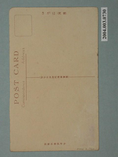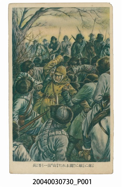 1.本物件為以九一八事變為主題之明信片,其正面為遭敵人包圍之山田一等兵彩色繪圖,畫面中可見一群身著藍衣之敵軍-中國士兵,包圍一名日本士兵,可見該日本兵遭敵人架住,束手無策,遠景尚有一批騎馬之敵軍,明信片下方有「遂に敵に圍まれた山田一等兵」字樣,背面為空白明信片橫式書寫面,以紅褐色單色印刷,右上方為郵票黏貼處,右側有「郵便はがき」,左側有「少年俱樂部附錄」,正上方有「POST CARD」以及「Correspondence」、「Address」,正中間則有「滿洲事變記念ゑはがき」字樣。2.九一八事變,又稱「瀋陽事件」,日本則稱之為「滿洲事變」,事件導火線為西元1931年9月18日,日本自導自演將南滿鐵路炸毀,日本之關東軍遂以此為由進攻瀋陽,進而侵占中國東北一帶,隔年3月,日本扶植滿洲國成立於此,東北一帶自此遭滿洲國佔領,直至二戰結束滿洲國瓦解。