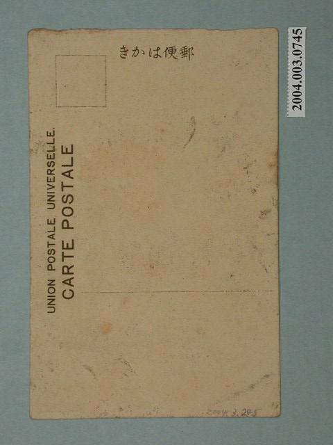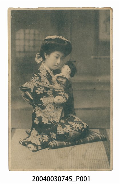 1.本物件為以女人為主題之明信片,其正面為著和服並抱玩偶的女子黑白照片,畫面中可見女子著和服跪坐於榻榻米上,其長髮盤起髮髻,頭頂及後頸位置有緞帶裝飾,和服上有各種花瓣,樣式繽紛,女子懷中抱有一人像娃娃,依遠景景象可判斷女子位在室內;背面為空白明信片橫式書寫面,以黑色單色印刷,右上方為郵票黏貼處,右側有「郵便はがき」字樣,正上方有「UNION POSTALE UNIVERSELLE.」以及「CARTE POSTALE」字樣。2.和服為日本傳統服飾,其名稱相較於「洋服」而來,和服為成套連身衣著,有數層,配件以腰帶為主,為長袖且幾乎遮蔽全身。