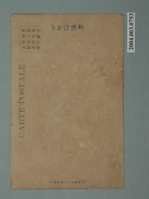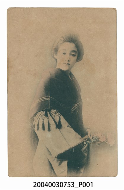 1.本物件為以女人為主題之明信片,其正面為著和服的女子黑白照片,畫面中可見女子盤起髮髻,臉部正對鏡頭,身著深色和服但樣式特殊,於袖子上有雙層,較短的一層有網狀及流蘇樣式,十分特殊;背面為空白明信片直式書寫面,以藍色單色印刷,左上方為郵票黏貼處,內有「內國は壹錢五厘外國は四錢郵券貼用」字樣,正上方有「郵便はがき」字樣,正下方有「(東京日本葉書會製)」,左側有「CARTE POSTALE」字樣。