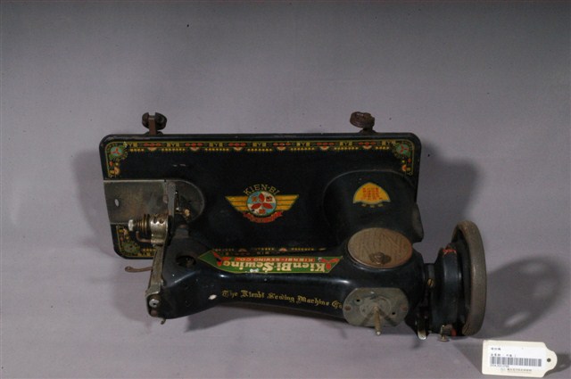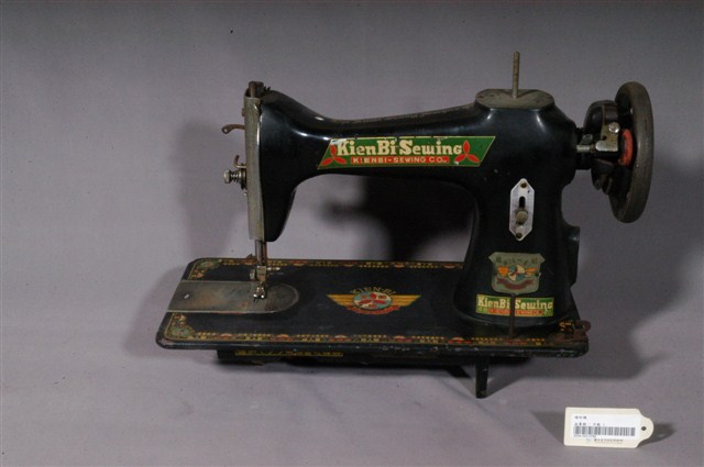 本文物為Kien Bi Sewing牌手搖式縫紉機,主要為金屬材質,以黑色為底,機台上有著黃色、紅色的紋路圖案。在兩面機器與右下方有著英文標示,寫著Kien Bi Sewing。縫紉機表面有多處的生鏽與污漬。將線軸放入右側的長棍裡,再將線固定在左側的機台上,就可轉動黑色握把,自行調整縫紉速度。1970年英國人湯瑪斯‧聖特(Thomas Saint)為提高製鞋效率設計手搖裁縫機,在多次的改良之下,時至1853年多數家庭使用之腳踏裁縫機才出現。而傳統家庭中的縫紉工作多由女性擔任,因此縫紉機出現反映女性生活與科技互動,所產生工作型態之改變,也成為當時必備的嫁妝品。