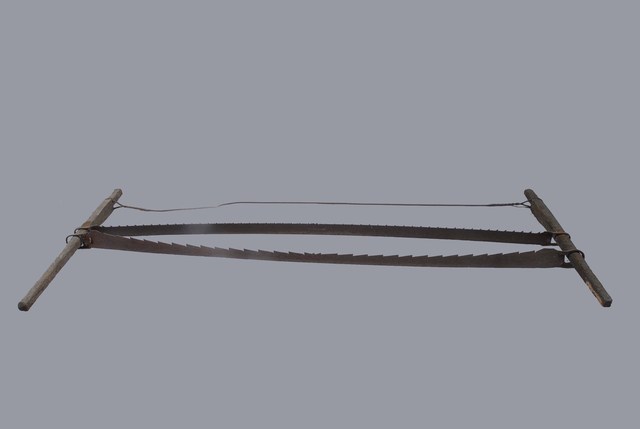 本文物為穿筒鋸,又稱弓鋸,為大型鋸,需兩人同時使用。為伐木工使用的鋸子,用以鋸倒樹木及切割樹材,特稱為穿筒鋸。穿筒鋸以金屬鋸片和鋸框、調整繩組成。本件有兩件鋸片,鋸片兩端作成圓箍套入木握柄。位於中間的鋸片取代傳統穿筒鋸的支撐桿,使本件鋸可同時鋸兩個鋸面。使用時向下施力推鋸,拉回時輕拉。鋸片兩端與鋸條垂直的木條為握柄,操作時一人握持一側握柄。與鋸片平行的另一端鐵線為調整繩。本件調整繩為鐵線,應為1970年代以後製品。
