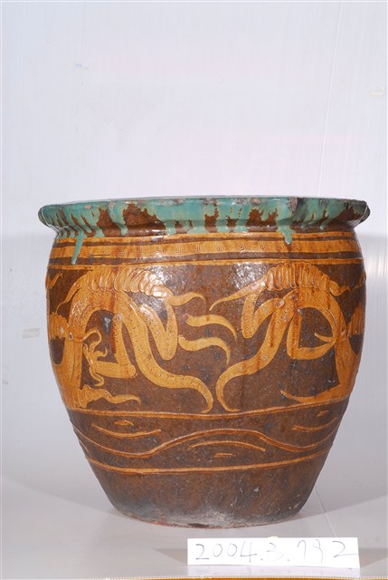 褐釉龍紋皮蛋甕,廣口,口沿外折,頸略內縮,器腹上寬下窄。外器壁上方飾有三圈粗細不等的橫條紋,粗條紋上刻有幾何方框,下方飾以橫線和波浪紋,中央刻有龍戲珠圖樣,施褐色釉,顏色底深紋淺。口部及內器壁施青綠色釉,口沿外側有多道釉料流下的痕跡。
