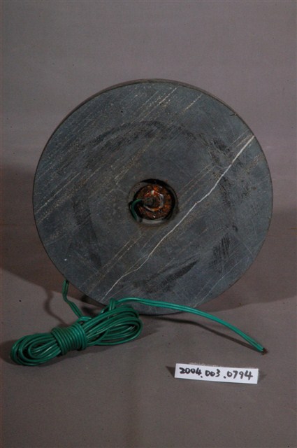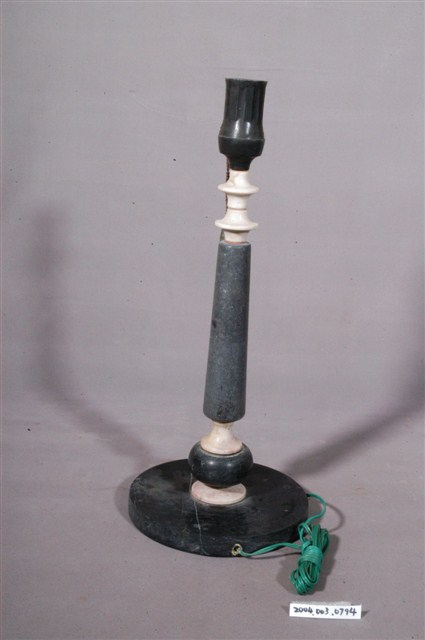1.本件石製立柱式燈座為使用電燈照明之燈具,底座為黑色石材製作成圓餅狀,表面帶有白色線條。底座中心處立有一柱,以相同黑色石材製作圓球形與上寬下窄之長柱形,另以白色石材做錐體與突起環形弦紋套筒,交替間隔。燈座頂端為黑色筒狀之電燈座,一身側帶有鐵製鍊條,拉動鍊條作開關切換。2.臺灣於1920年代開始生產電燈泡,隨著電力的普及與需求興起,相關電器乃至於電燈泡開始大量生產,1941年成立「新竹電泡製造工廠」為專門生產電燈泡之工廠。