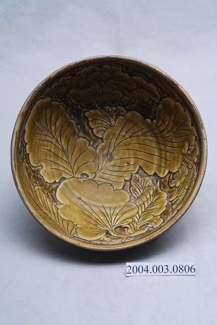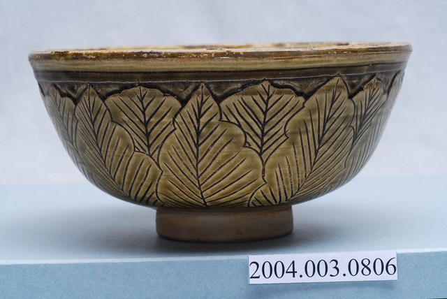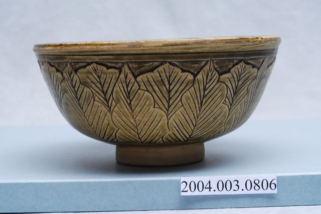 褐釉刻花葉紋碗方唇,直口,鼓腹,直斜壁下斂至圈足,碗底近圈足處略作方折,圈足稍高且圈足徑略小。全器以機器鏇坯而成,碗心處可見鏇坯痕跡。內、外壁以刻花手法做葉紋。通施褐色釉,釉色古樸沈穩,薄釉,微微透出塑坯時的紋路。刻花的技巧是指在素坯的坯體上以直刀手法雕刻出花紋後,在施釉窯燒。碗外壁葉紋布排規整,雙層交疊的葉片環繞整個碗;內壁的葉紋表現較為活潑,大小、形狀以及布排皆充滿變化,使得畫面生動活潑,充滿層次感。