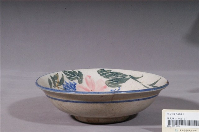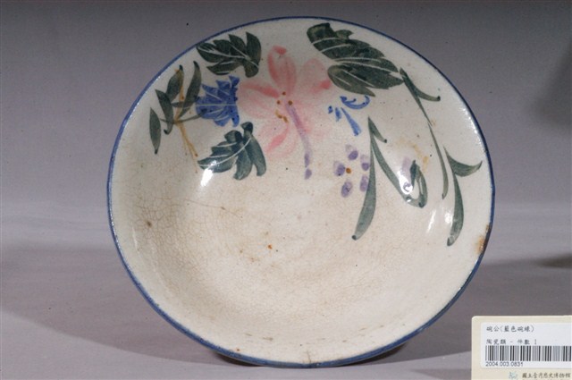 彩繪花卉紋折沿碗公,為形制較大的湯碗,民間俗稱「碗公」。撇口,折沿,弧腹,器底略作方折,底有圈足。全器施白釉,碗內外壁與外碗心皆可見開片,口沿有一道較明顯的裂紋向下延伸至腹部,表面被使用過的汙漬覆蓋略呈褐黃色,頗具歷史感。口沿以鈷藍色釉料塗滿,圈足底露胎,胎色灰白。碗外壁以一褐一藍上下裝飾兩組細線弦紋,碗內壁以青、綠、褐、紫、粉紅等色彩繪花卉紋,以一朵盛開的扶桑為主體,二旁綠葉和紫色小花為陪襯。