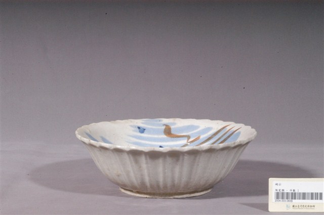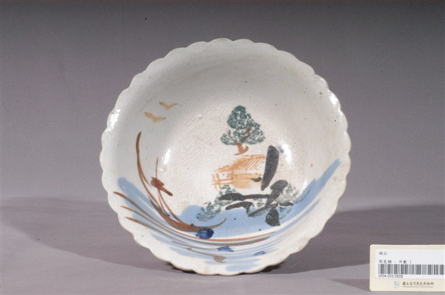 彩繪山水紋菱花口碗,為戰後初期家庭常見之餐飲用器,以模具成形,並於白色長石釉上裝飾彩釉之後,高溫燒成。敞口,弧壁,底帶圈足,碗口與碗身作菱花瓣造型,共三十二瓣,整個碗猶如一朵盛開的花朵。全器施白釉,表面略帶氣孔,內外碗心皆有細小開片,圈足底露胎,胎色米白。碗外壁素面無紋,主要圖案位於碗心及碗內壁一側,採用彩繪與印花兩種技法,以藍、綠、黑、褐彩顏料描繪山水風景,竹籬、房舍與綠樹採用印花裝飾技法,近水、孤舟、枯木與飛鳥則以純熟筆法寫就。整體畫面構圖立體,色彩搭配合宜,賞心悅目。
