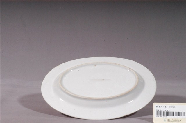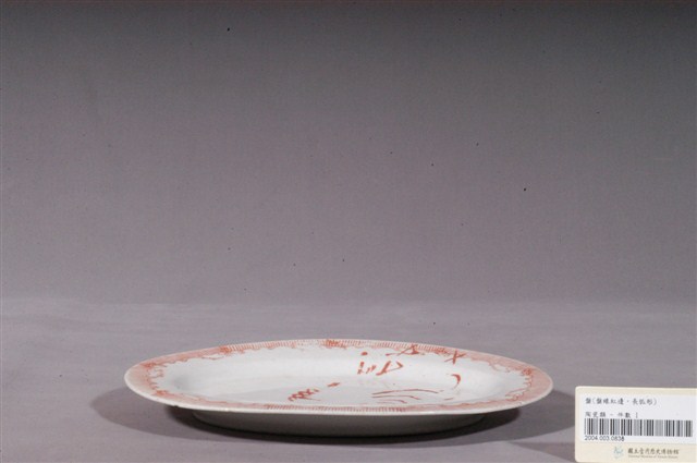 印繪白瓷紅蝦折沿橢圓盤為高溫燒製且以模具塑成形,圓唇,寬折沿,口沿稍微不平整,淺腹,弧壁短,下斂至圈足,圈足露胎,胎色白中略帶黃,胎質細膩。全器施白釉,呈色淨白潤澤,釉面光滑。盤外壁素面無紋,折沿處則以紅釉轉印線條為主的花草狀紋飾。由於紋飾以模板轉印,可見模板之間重疊交印的狀況。主要紋飾為繪於盤內中心的大蝦,不過已經幾乎磨損,僅存大致輪廓。可見是以模具施紅釉勾勒出大蝦的輪廓,紅釉發色飽和濃重。