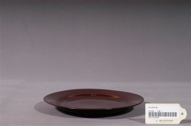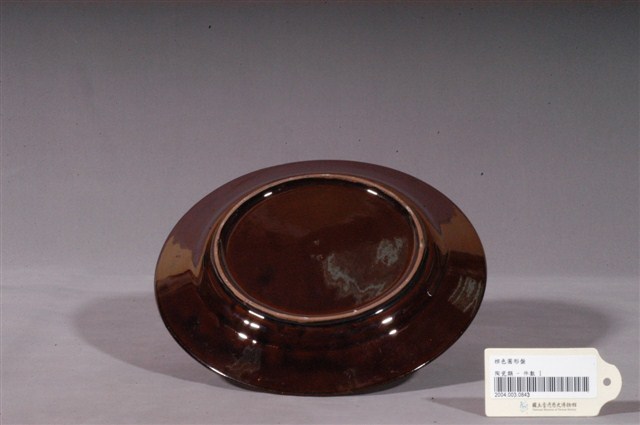 1.紅陶褐釉折沿圓盤圓唇,口沿外侈,寬折沿,折沿略不平整,淺腹,斜弧壁下收至圈足,圈足徑適中,約等同於口徑一半的大小,圈足露胎,為紅陶胎,胎色均勻,胎質較細。全器滿施身褐色釉,釉面光滑瑩潤,呈色飽滿,器底釉色有些微變化,可能是燒製溫度變化所產生的瑕疵。全器內外壁素面無紋,以釉色做主要表現,簡潔內斂。2.此類紅陶器皿是1950年代左右常見的作品,當時因物資較短缺,各窯廠燒製紅陶胎為主的器具,反映出當時的社會背景。
