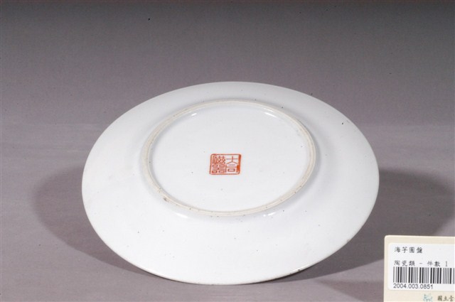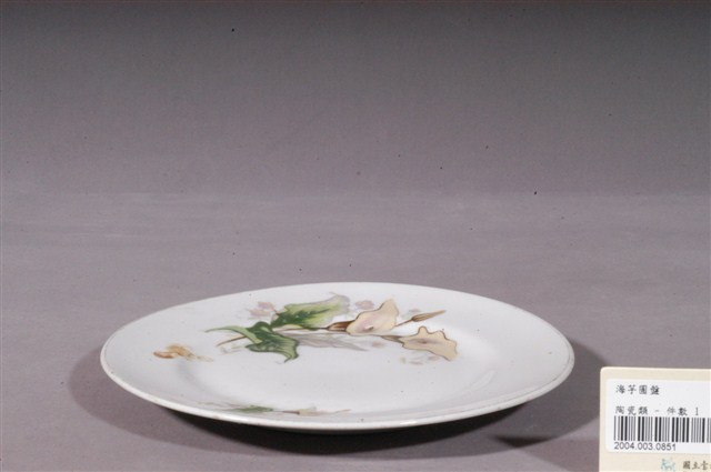 1.釉上彩轉印海芋紋圓盤為高溫燒製,圓唇,口沿外侈,寬折沿,斜弧壁下收至圈足,圈足徑適中,約等同於口徑一半的大小,圈足露胎,胎色白中略帶黃,胎質細緻。全器滿施白釉,釉面光滑瑩潤,呈色飽滿潔白,器表有幾處氣孔,是因高溫燒製導致而成的現象。盤外壁素面無紋,僅盤內有紋樣裝飾。口沿處以銀線勾勒弦紋,盤內兩側折沿處繪海芋紋樣。紋飾以多種釉色轉印而成,主要由綠釉、淡黃色釉、褐色釉以及淺灰色釉繪製,花卉描繪細緻,頗具立體感,整體構圖層次井然。盤底圈足內帶有紅色方形「大同磁器」篆書款識,是較早期的大同瓷器作品。2.光復後臺灣製瓷以大量製造為主要生產模式,因此在紋飾上常以同樣的模板製作出整批的瓷器,也因此常見有相同模板的作品。