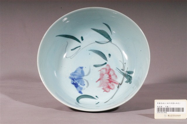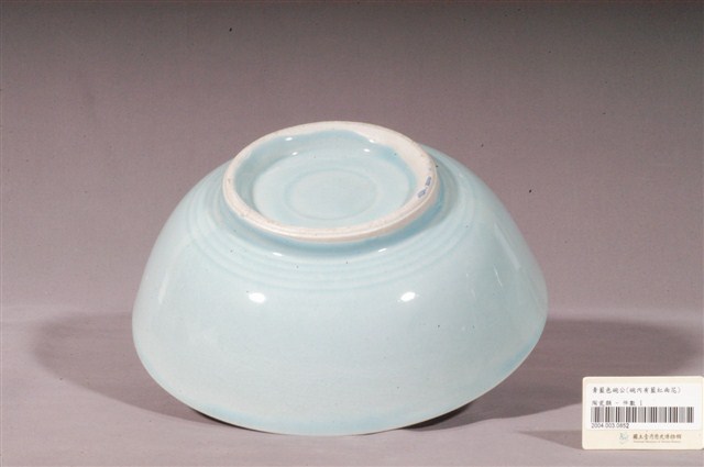 天青釉彩繪花卉紋碗公,為形制較大的湯碗,民間俗稱「碗公」。此件碗公以模製成形,敞口,弧壁下收,碗身寬大且深,圓腹,底有圈足,碗底心壓印同心圓面與細弦紋造型,圈足上方另有數道細刻弦紋,增加造型變化。碗內外器壁施天青色釉,釉色隨弦紋壓痕深淺變化,圈足露胎,胎色為白色。碗外壁素面無紋,碗內壁裝飾多彩花卉紋,一紅、一藍兩朵盛開的花朵搭配綠葉,恣意奔竄器面,色彩繽紛,春意盎然。