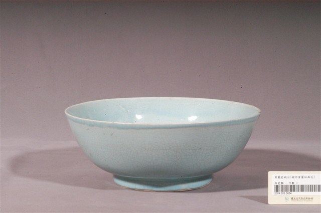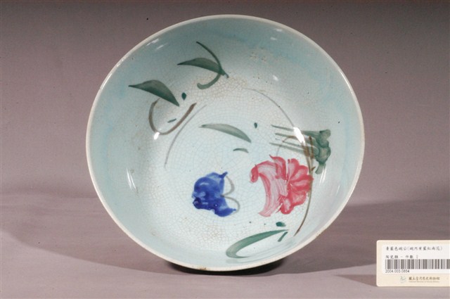天青釉彩繪花卉紋碗公,為形制較大的湯碗,民間俗稱「碗公」。此件碗公以模製成形,敞口,弧壁下收,碗身寬大且深,圓腹,底有圈足,碗底心壓印同心圓面與細弦紋造型,圈足上方另有數道細刻弦紋,增加造型變化。碗內外器壁施天青色釉,釉色隨弦紋壓痕深淺變化,表面佈滿細小開片,口緣與圈足有流釉痕跡,呈稍微深一點點的青藍色,圈足底露胎,胎色為白色。碗外壁素面無紋,碗內壁裝飾多彩花卉紋,一紅、一藍兩朵盛開的花朵搭配綠葉,恣意奔竄器面,色彩繽紛,春意盎然。
