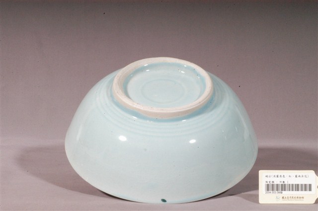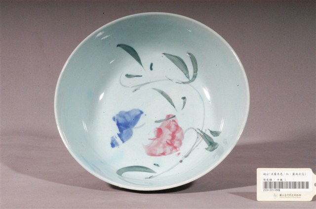 1.天青釉彩繪花卉紋碗公,以模製成形,敞口,弧壁下收,圓腹,底有圈足,碗底心壓印同心圓與細弦紋造型,圈足上方另有數道細刻弦紋,增加變化。碗內外器壁施天青色釉,釉色隨弦紋壓痕深淺變化,圈足露胎,胎色為白色。碗外壁素面無紋,口緣有一綠色斑點,應為施作時釉料不小心滴下所致,碗內壁裝飾多彩花卉紋,一紅、一藍兩朵盛開的花朵搭配綠葉,恣意奔竄器面,色彩繽紛,春意盎然。2.碗的形制有分較大的湯碗和較小的飯碗,湯碗臺灣民間俗稱「碗公」,多用來盛裝菜湯,是臺灣家庭中常見的民生瓷器。