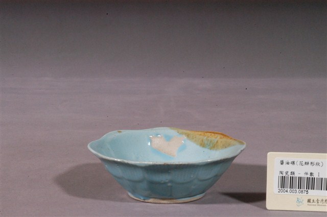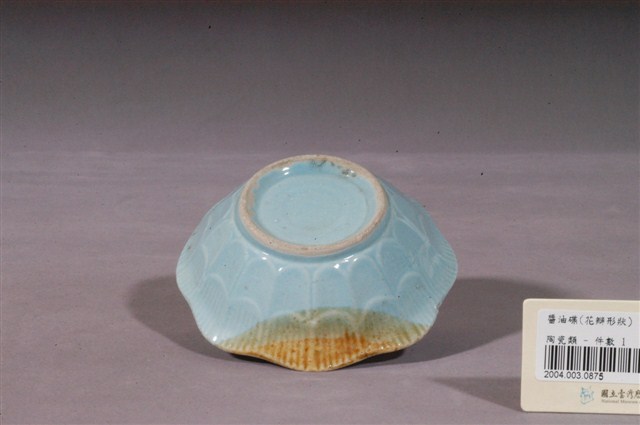 青瓷醬釉花形碟為高溫燒製且由模具成形,薄圓唇,平口,口沿外侈,淺圓腹,斜直壁下收,碟底緣方折,平收至圈足,圈足,圈足露胎,胎色白中略帶黃,胎質略粗。器形做波浪狀花口,外壁以模具塑出雙層花瓣般的效果,近口緣處的花瓣內以數條陰刻平行線條作為花瓣內之裝飾。全器施青色釉,釉面瑩潤,呈色十分淺且偏天青色,釉色均勻,不過器表有多處因高溫燒製導致而成的氣孔,因而略顯得釉面較為粗糙。器形一端施較深的褐色釉,發色與施釉皆不均,多處透露出底下的青色釉。全器多處有因燒製溫度過高導致的脫釉與縮釉痕跡,如碟心以及深色釉裝飾處。器內壁素面無紋飾,僅以釉色變化為主。