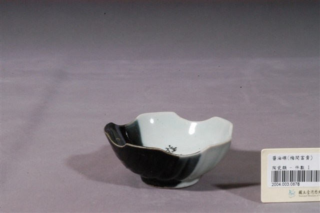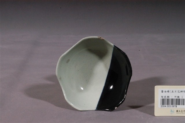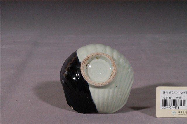 青瓷黑釉花口小碗為高溫燒製且由模具成形,薄圓唇,平口,口沿微微外侈,圓腹,弧壁下收至圈足,圈足徑較小,圈足略高,圈足露胎,胎色白皙,胎質細緻。器形作高低起伏的波浪狀五瓣花口,外壁以模具塑數條突稜線條裝飾,配合器形的花口狀形塑出花瓣般的裝飾效果。全器施青色釉,釉面瑩潤,呈色較淺,釉色均勻薄透,器形半邊以浸染的方式上黑釉,形成鮮明的對比效果。