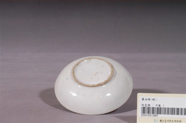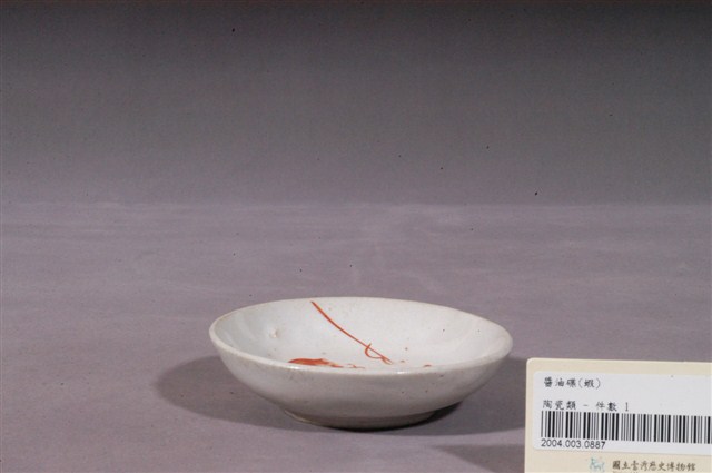 1.印繪白瓷紅蝦圓碟圓唇,平口,淺腹,弧壁下收至圈足,圈足露胎,胎色白中帶黃,胎質略粗,圈足周圍略有窯沙沾黏。全器施白釉,釉色微微泛青,釉面光潔,不過器表有許多因高溫燒製導致而成的氣孔,釉面較不平整。碟外壁素面無紋飾,碟心轉印一紅色大蝦紋樣,不過此件作品中的蝦紋有較嚴重的磨損,並不能清楚見到整體的表現。由部分紋飾依然可見是以模具施紅釉勾勒出蝦紋的輪廓,再以同樣的釉料為蝦身填彩。紋飾的紅釉呈色略淺,發色略有不均。2.尺寸較小、器深較淺的碟子俗稱「醬料碟」,一般用來放置調味料,也可當作放置母匙、湯匙等的小碟子。