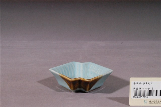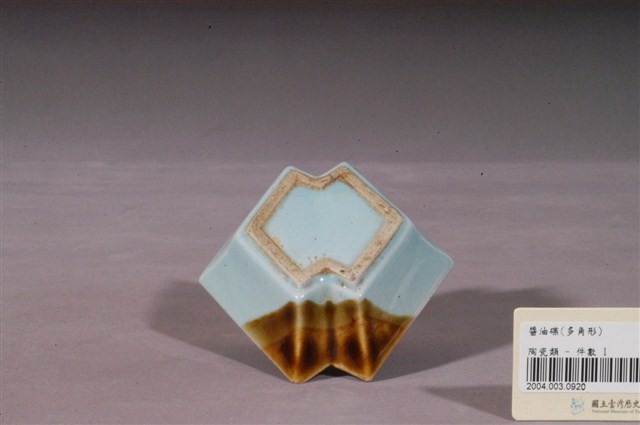 青瓷醬釉方形碟為高溫燒製且由模具成形,薄圓唇,平口,口沿微外侈,斜直壁下收,碟底緣方折,平收至圈足,圈足扁平,圈足露胎,胎色略黃,胎質雖細但有摻有雜質。器形為多邊形,形似將兩個菱形相疊而成,因此全器呈不等邊的八邊形。全器施青色釉,釉面瑩潤,呈色較淺且略帶藍,不過器表有些許因高溫燒製導致而成的氣孔,且釉面有施釉不均之處,器內壁以及圈足內圈有積釉。器形一端施深褐色釉,發色較淺且施釉不均,多處透露出底下的青色釉。器外壁素面無紋飾,僅以釉色變化為主。內壁則以突稜的線條裝飾,並模印出不同的紋樣:器壁模印出斜直線條或格子狀的紋飾,碟心則印出稜角狀重疊出來的花朵形裝飾。模印的紋樣與器形本身的線條設計感相符,皆屬於有稜有角、較為硬挺的線條感。