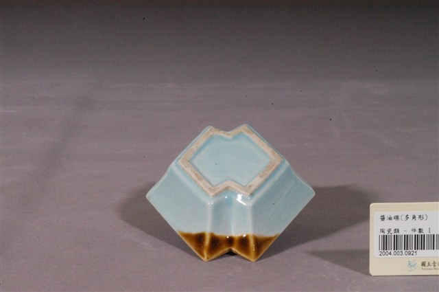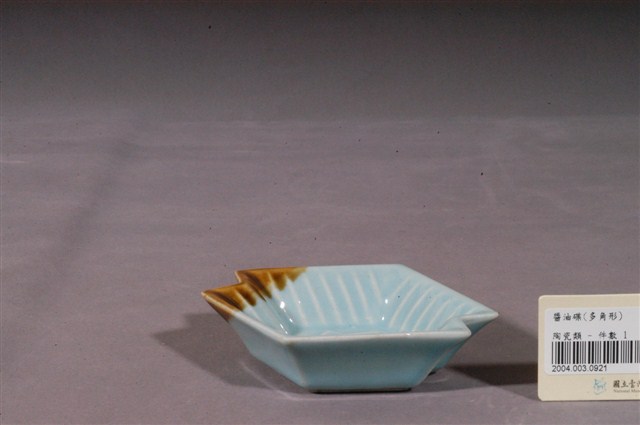 青瓷醬釉方形碟為高溫燒製且由模具成形,薄圓唇,平口,口沿微外侈,斜直壁下收,碟底緣方折,平收至圈足,圈足扁平,圈足露胎,胎色白中略帶黃,胎質較細。器形為多邊形,形似將兩個菱形相疊而成,因此全器呈不等邊的八邊形。全器施青色釉,釉面瑩潤,呈色較淺且略帶藍,不過器表有些許因高溫燒製導致而成的氣孔,且釉面有施釉不均之處,器內壁以及圈足內圈有積釉。器形一端施深褐色釉,發色較淺且施釉不均,多處透露出底下的青色釉。器外壁素面無紋飾,僅以釉色變化為主。內壁則以突稜的線條裝飾,並模印出不同的紋樣:器壁模印出斜直線條或格子狀的紋飾,碟心則印出稜角狀重疊出來的花朵形裝飾。模印的紋樣與器形本身的線條設計感相符,皆屬於有稜有角、較為硬挺的線條感。
