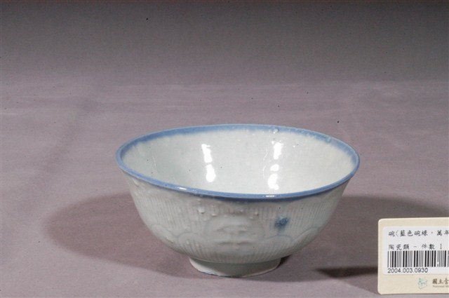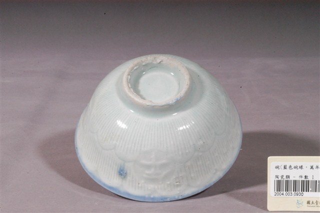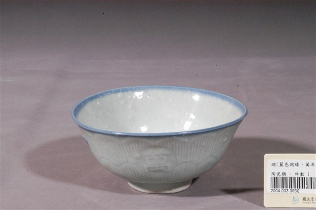 1.萬年富貴字紋淡青碗,為戰後初期臺灣鶯歌窯所生產,以模製成形,敞口,口沿略外撇,碗口稍有歪斜,弧壁下收,底有圈足。碗內壁素面無紋,外碗壁等距離壓模四個圓形開光,內刻「萬年富貴」四字陽紋,其餘面積作上下二層細瓣蓮花造型。全器除圈足底露胎外施淡藍釉,口沿以深藍釉塗滿,腹部上方有一深藍色斑點,應為施作時釉料不小心滴下所致。碗外壁的釉色隨紋飾深淺變化,凹陷的地方積釉顏色較深,凸起的地方釉層較薄顯得釉色較淡,釉色深淺交錯,使紋飾清晰浮現,頗具層次美感。2.碗的形制有分較大、臺灣民間俗稱「碗公」的湯碗和形制較小的飯碗。本物件屬於形制較小的飯碗,其釉色和淺浮雕裝飾技法,可歸類為「淡青碗」的一種。淡青碗最早可能是由臺灣鶯歌任職於泉興窯的周安華所開發,最早的釉色是淡綠色,後來又開發出淡藍色、淡褐色等其他顏色。此件淡清碗的釉色為水藍色,又被稱作「水清碗」。