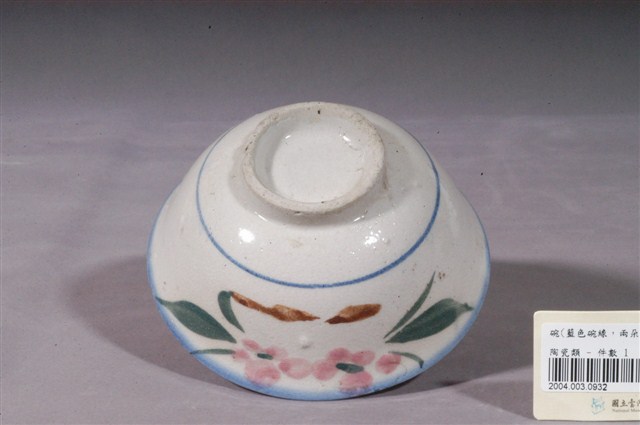 1.彩繪粉紅彩花卉紋碗,以模製成形,敞口,口略外撇,弧壁下收,圓腹,底有圈足。全器除圈足底露胎外施白釉,表面有許多氣孔與斑點,碗外壁有幾顆小圓凸起,圈足外直內斜,部分缺損,露胎處呈白色。口沿以青色鈷料塗滿,碗內壁素面無紋,碗外壁下方裝飾一圈青花弦紋,腹部一側以褐、綠、粉紅彩,採沒骨技法描繪花卉紋,綠色長形葉片向左右二邊外撇,中間以粉紅彩暈染二朵梅花花瓣,花瓣下方二筆褐色橫槓作為梅枝。2.粉紅彩紋飾經常出現在鶯歌碗盤中,這種釉彩的應用在日治時期已開始流行,戰後仍沿用許久。粉紅彩傳入臺灣後,臺灣北部窯廠紛紛開始模仿,由於鶯歌窯的發展在北投窯之後,當時許多北投窯的工人遷居到鶯歌,同時將紋飾帶去,因此推測粉紅釉彩的流行也是從北投傳到鶯歌。