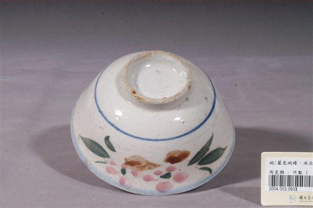 1.彩繪粉紅彩花卉紋碗,以模製成形,敞口,口略外撇,弧壁下收,圓腹,底有圈足。全器除圈足底露胎外施白釉,表面有許多大小不等的氣孔與斑點,圈足外直內斜,露胎處呈灰褐色。口沿以青色鈷料塗滿,發色較淺呈淡青色,略縮釉與剝釉。碗內壁素面無紋,碗外壁下方裝飾一圈青花弦紋,腹部一側以褐、綠、粉紅彩,採沒骨技法描繪花卉紋,綠色長形葉片向左右二邊外撇,中間以粉紅彩暈染二朵梅花花瓣,花瓣下方二筆褐色橫槓作為梅枝,花卉紋下方微微縮釉。此碗緣口與圈足皆有些許汙漬痕,可見曾被頻繁使用。2.粉紅彩紋飾經常出現在鶯歌碗盤中,這種釉彩的應用在日治時期已開始流行,戰後仍沿用許久。粉紅彩傳入臺灣後,臺灣北部窯廠紛紛開始模仿,由於鶯歌窯的發展在北投窯之後,當時許多北投窯的工人遷居到鶯歌,同時將紋飾帶去,因此推測粉紅釉彩的流行也是從北投傳到鶯歌。