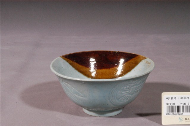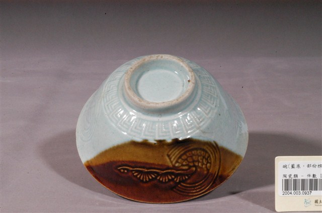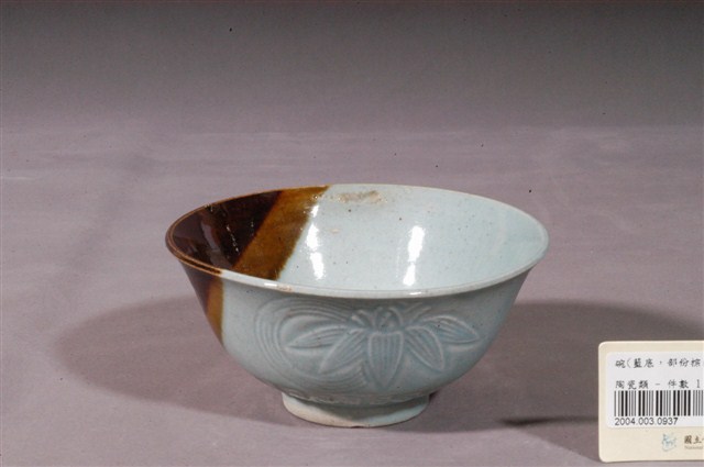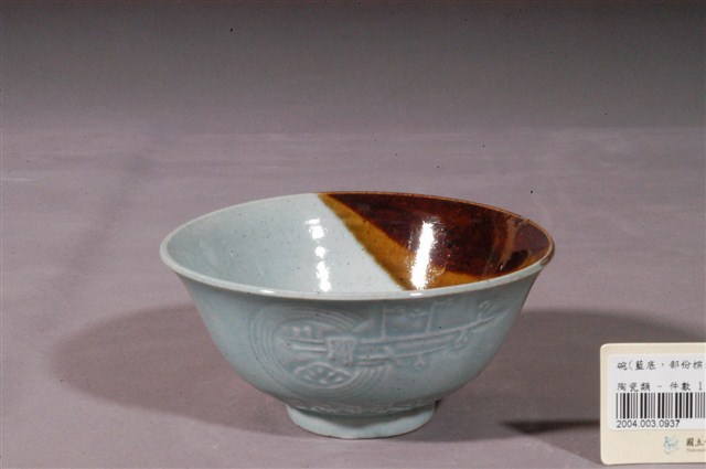 1.松竹梅紋水青陰陽碗,敞口,口略外撇,弧壁下收,圓腹,底有圈足,以模製成形,採用壓模裝飾淺浮雕圖案,施釉燒製而成。碗內壁素面無紋,緣口有一小塊氣泡聚集,碗外壁等距離壓印松、竹、梅紋樣,旁襯半開放環形紋,近底處裝飾一圈交疊的回字紋。碗內外壁施淡藍釉,一側再施二層半月形褐色釉彩,一深一淺創造色彩變化,圈足底露胎,胎色灰白。碗外壁上的釉彩也隨著浮雕紋飾變化,凹陷的地方積釉顏色較深,凸起的地方釉色較淡,使紋飾更具立體感。2.碗的形制有分較大、臺灣民間俗稱「碗公」的湯碗和形制較小的飯碗。本物件屬於形制較小的飯碗,是在1950至1960年代相當流行,臺灣鶯歌窯所生產的「陰陽碗」,由淡青碗改良而來,淡藍釉色的淡青碗又稱「水青碗」,將褐色釉交疊在淡藍色釉上,一明一暗如同太極的意象。淡青碗最早可能是由臺灣鶯歌任職於泉興窯的周安華所開發,最早的釉色是淡綠色,後來又開發出淡藍色、淡褐色等其他顏色。