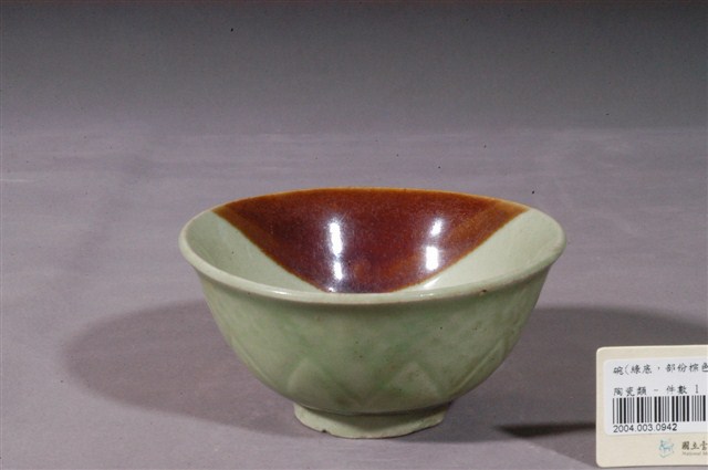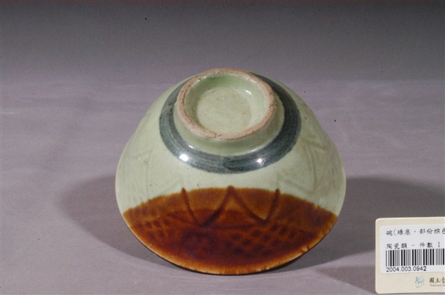 1.葉紋丹青陰陽碗,敞口,口略外撇,弧壁下收,圓腹,底有圈足,以模製成形,採用壓模裝飾淺浮雕圖案,施釉燒製而成。碗內壁素面無紋,碗外壁腹部上半裝飾三葉草與斜格紋,下半部裝飾大片尖角葉紋。碗內外壁施綠釉,一側再施二層半月形褐色釉彩,深淺色塊相互搭配,圈足上方施一圈深綠色釉彩,增添色彩變化,圈足底露胎,有小裂痕,胎色灰褐。碗外壁上的釉彩也隨著浮雕紋飾變化,凹陷的地方積釉顏色較深,凸起的地方釉色較淡,使紋飾更具立體感。2.碗的形制有分較大的湯碗和較小的飯碗,湯碗臺灣民間俗稱「碗公」。本物件屬於形制較小的飯碗,是在1950至1960年代相當流行,臺灣鶯歌窯所生產的「陰陽碗」,由淡青碗改良而來,青綠釉色的淡青碗又稱「丹青碗」,將褐色釉交疊在青綠色釉上,一明一暗如同太極的意象。淡青碗最早可能是由臺灣鶯歌任職於泉興窯的周安華所開發,最早的釉色是淡綠色,後來又開發出淡藍色、淡褐色等其他顏色。
