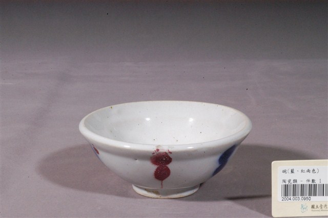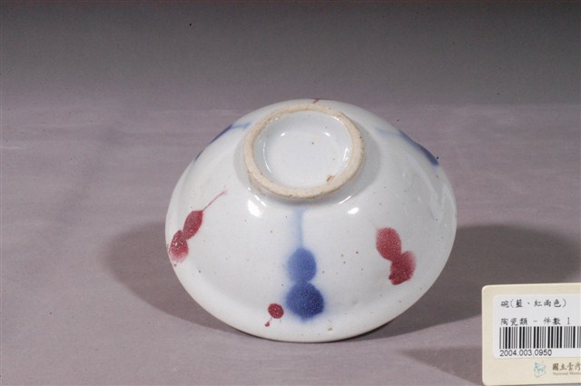 1.紅藍彩繪印花生意碗,撇口,折沿,碗外壁口緣下方作一內凹折痕,折痕以下呈圓弧形下收,底有圈足。以模具成形,施釉彩繪裝飾後高溫燒成。全器施白釉,釉色略帶乳白色調,表面有明顯氣孔與雜質斑點,圈足底露胎,胎色米白。碗內壁素面無紋,碗外壁採用彩繪印花技法,將花紋刻在印模上,沾染紅色和藍色釉料,間隔蓋印出點狀與細線組成的規則紋飾,其中一藍色紋飾旁有一滴紅色斑點。2.生意碗為小吃攤喜愛使用,業者稱為「生意碗」的小吃碗,常見於滷肉飯、肉圓、肉羹等小吃攤。它的形制相當特別,通常胚體厚重,外折的口沿使碗面看起來比一般飯碗大,但碗的下半部向內收縮,碗身也淺,因此在視覺及重量上會讓客人覺得食物份量很多,但實際盛裝的並不多。