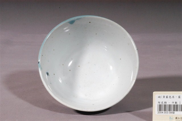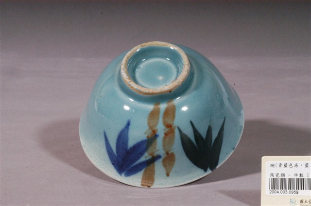 1. 彩繪竹紋青釉碗平口微外侈、弧壁、圓腹、帶圈足碗。以模具成形,圈足以外,全器滿釉,底足刮釉露胎,略不平整,胎色偏黃,胎質略粗。器表有多處氣孔,內壁素面無紋,口沿處略有流釉痕跡。外器壁滿施淡青色釉,呈色略有不均,靠近口緣處發色皆較淺淡,外器壁兩側裝飾彩繪竹紋,先以褐彩描繪粗壯的竹節幹枝,再用青花鈷料與黛綠釉彩左右開展飽滿碩實的竹葉,用筆厚實遒勁,紋飾簡單有活力。2. 戰後初期家庭常見之釉下多彩瓷碗。1940年代開始臺灣窯場逐漸發展釉下多彩技法,隨著化學合成釉彩推陳出新,碗盤餐具的繽紛色彩豐麗多變。因此