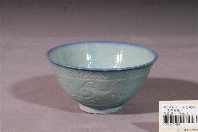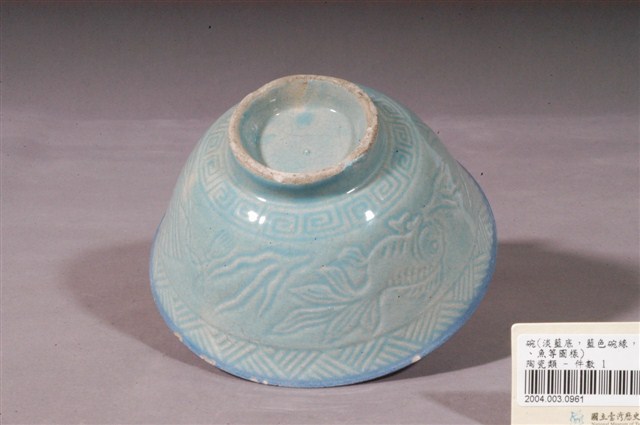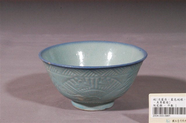 1. 藍釉吉祥紋淡青碗敞口微侈,圓弧壁下接圈足,壓模成形。圈足刮釉露胎,多沾黏窯沙,多處缺損。全器施以淡青色透明釉,器口施塗一道較深的藍釉,青藍色調和諧地呼應。內器面素面無紋,外器壁口沿部分飾以一道蓆紋,器腹以淺浮雕飛鳥、摺扇、金魚等吉祥紋飾作為主題,近圈足處以模壓成形的方式飾一圈回字紋飾。而且釉彩隨著淺浮雕圖案多重變奏,線條凹陷的地方積釉深厚,顏色較深,高凸之處釉層較薄,顯得顏色較淡,頗有光影閃耀的視覺效果。2. 戰後初期流行,俗稱為「淡青仔碗」的彩瓷飯碗。戰後初期流行的飯碗樣式之一,1950年代前後