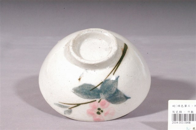 1. 黛綠粉紅彩花卉紋碗敞口、圓弧腹、帶圈足碗,圈足外直內斜。灰胎,採鏇坯壓模、釉下彩繪之後施釉高溫燒製而成。全器施白釉,釉色淨白。碗外器壁上方裝飾寫意沒骨法的黛綠粉紅彩折枝花卉紋,釉下彩繪以深綠釉料作花蕊及葉,粉紅顏料作花瓣,濃淡有致。內器壁素面無紋,不過器表有許多因高溫燒製導致而成的氣孔,釉面較不平整。2. 粉紅彩色料,其引進臺灣比釉下青花鈷料年代略晚,但可能日治時期已開始使用。早期碗盤很常只用青花作紋樣裝飾,約民國四十年代開始加入粉紅釉裝飾,使裝飾的色彩有了變化。這樣的裝飾風格風行一時,尤其以鶯歌