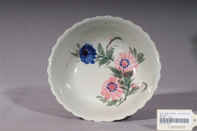 彩繪花卉紋綠釉花形碗高溫燒製,並以模具成形。圓唇,敞口,弧壁,圓腹,碗底深且寬,大圈足,圈足露胎,胎色較白,胎質細膩略有雜質。全器施淡青色釉,呈色均勻且十分淡雅,色澤瑩潤內斂,有些微氣孔與雜質沉澱。口沿作波浪花口,內側模印三條圈紋,紋飾集中於碗內壁一側,以藍、粉紅、黛綠色釉料描繪大朵花卉紋飾,紋飾生動充滿活力,用筆飽滿又不失隨性自然。整體以數株完整的花朵為主題,以大小變化的葉片襯托出花朵綻放的效果,構圖完整。外壁沒有手繪紋飾,以模具壓印出長條狀,增添壁面變化,使整體造型呈現出有如花朵般綻放的效果。器底圈足