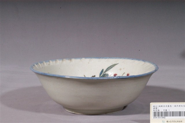 手繪粉紅彩花卉紋花口碗高溫燒製,並以模具成形。圓唇,敞口,弧壁,圓腹,碗底較淺且寬,大圈足,圈足露胎,胎色較白,胎質細膩無雜質。全器施白釉,呈色較潔白並帶暖黃色調,色澤瑩潤,器表亮澤,有些微氣孔。口沿壓印一圈方形繩紋,形成波浪狀,並施罩一圈鈷藍釉,呈色淡雅均勻。外壁沒有手繪紋飾,主要的花卉紋飾繪於碗內壁一側,並向碗心延伸。整體以一株完整的薔薇花朵為主題,用釉深淺有致,並搭配花苞、藤蔓等使構圖更加豐富。紋飾主要以粉紅釉表現,搭配黛綠釉與褐色釉,是民間常見的釉色選擇。