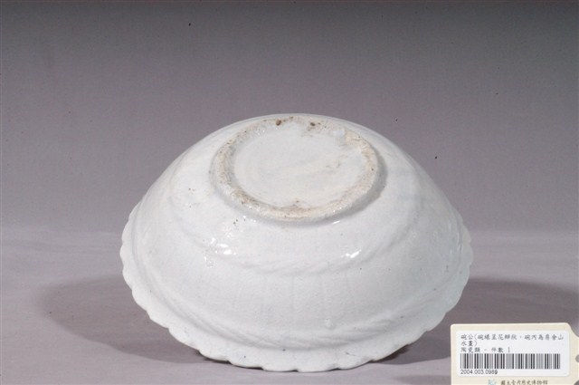 彩繪山水景緻花口碗以模具成形且高溫燒製而成。侈口,弧壁,淺圓腹,大圈足,圈足露胎,胎色略帶灰,胎質略為粗糙。圈足因刮釉且有窯沙沾黏,因此留下凹凸不平的痕跡,圈足底較不平整。全器施白釉,呈色帶青色調,釉面光潔,器表略有氣孔。內壁接近口緣處作三條凸起稜線,口沿作向外開展的波浪花口狀,共三十二個波狀起伏,外壁印有兩道橫向的繩紋,而縱向則有三十二條稜線將其貫穿,使得整件作品由外側看起來像是模擬出木桶般的效果與造型。主要紋飾以碗內壁的圖案為主,以深淺的鈷藍釉、淺黃褐釉等為主要色調,描繪湖水、漁船、遠山以及岸邊人家景