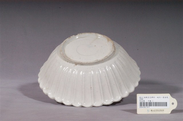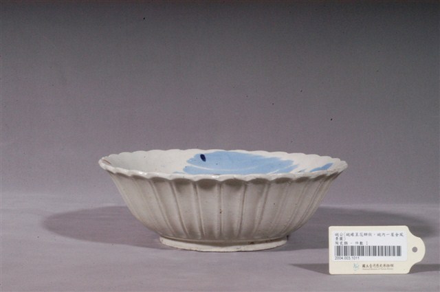 1. 彩繪岸邊人家花形碗以模具成形,高溫燒製,敞口,弧壁,圓腹,碗底較淺且寬,大圈足,圈足露胎,胎色白中帶灰且略有砂粒沾黏。全器施白釉,釉面光潔,器表略有氣孔,內壁略有旋胚痕跡。口沿作向外開展的花口狀,共三十二個波狀起伏。碗外壁素面無紋,僅以模具印出相同數量的花瓣稜脊,使得整件作品彷彿一朵綻放地恰到好處的花朵。主要紋飾以碗內壁的圖案為主,以青、藍、黛綠、黃褐彩等顏料描繪出湖水、老樹、飛鳥、竹屋以及遠山等景緻。用筆隨興灑脫筆法疏朗有力,不強調細節,意境幽遠。2. 此種大碗是戰後常見的家用瓷器,屬於六零年代