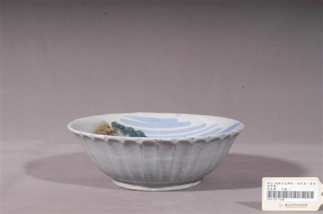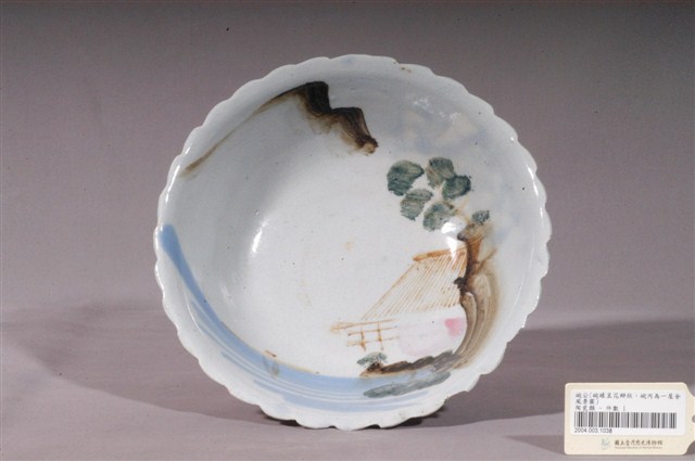 彩繪山水景緻花形碗以模具成形且高溫燒製而成。侈口,弧壁,淺圓腹,大圈足,圈足露胎,胎色略帶灰,胎質略為粗糙。圈足因刮釉因此留下凹凸不平的痕跡,圈足底較不平整。全器施白釉,呈色帶青色調,釉面光潔,器表略有氣孔。口沿向外開展的波浪花口狀,器外壁腹亦有一道波浪紋,沿著波浪紋向下延伸出縱向的稜脊。主要紋飾以碗內壁的圖案為主,以深淺的鈷藍釉、淺黃褐釉、綠釉等為主要色調,描繪湖水、遠山、綠樹以及岸邊人家景緻。紋樣的整體構圖簡潔,用筆隨性灑脫,僅對小屋作細節描繪,清淡雅致,意境清幽。整體的構圖應有模板對照,但施作的細節