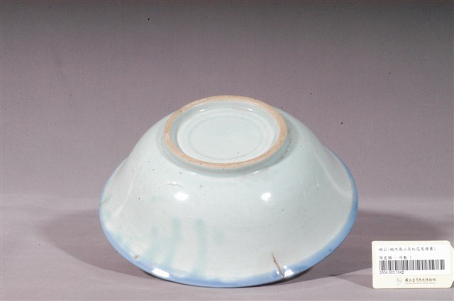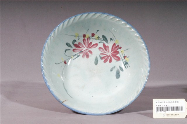 1.手繪花卉紋花口碗高溫燒製,並以模具成形。圓唇,敞口,弧壁,圓腹,碗底較淺且寬,大圈足,圈足露胎,胎色較白,胎質細膩無雜質。全器施透明淡藍釉,清澈透明,器表亮澤。口沿壓印一圈方形繩紋,形成波浪狀,並施罩一圈鈷藍釉,呈色淡雅均勻。外壁沒有手繪紋飾,主要的花卉紋飾繪於碗內壁一側。整體以兩株朱色花卉為主題,花瓣用釉深淺有致,並搭配枝葉和藤蔓等使構圖更加豐富。紋飾主要以紅釉表現,搭配黛綠釉與黃色釉,呈現繽紛活潑的氛圍。2.戰後初期流行,俗稱為「淡青仔碗」的彩瓷飯碗。戰後初期流行的飯碗樣式之一,1950年代前後