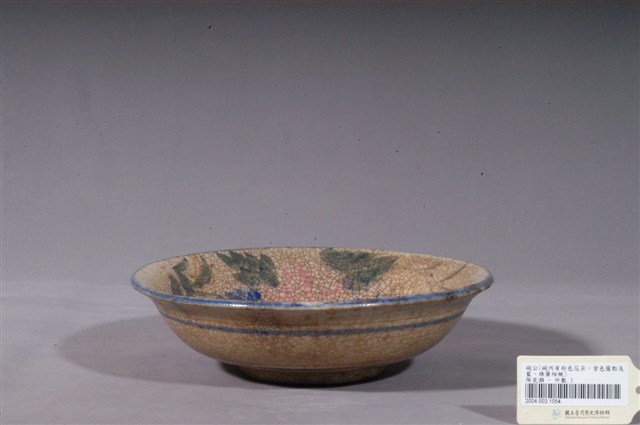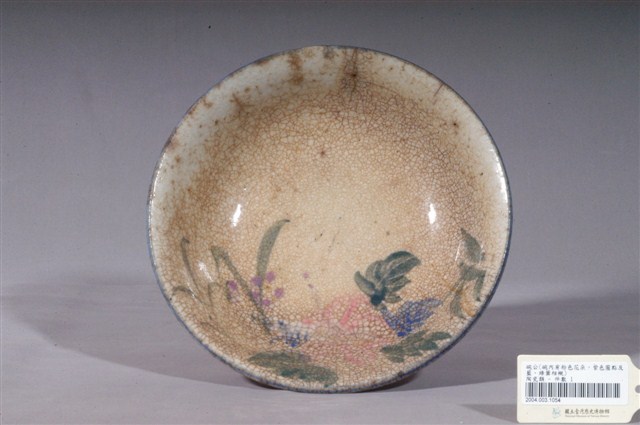 1.彩繪花卉紋碗高溫燒製,圓唇,敞口,弧壁,碗底較淺且寬,大圈足,圈足露胎,胎色偏灰,胎質略帶雜質且有窯沙沾黏。全器施白釉,因使用痕跡造成器表釉色呈泛黃現象,佈滿褐色開片紋路,且有諸多氣孔及裂紋。口沿處施一圈鈷藍釉,呈色略不均勻。外壁上緣及下緣處各繪兩組藍色及褐色組合的弦紋。主要的花卉紋飾繪於碗心一側。構圖主題為一朵盛開的粉紅花卉,並於四周延伸出小花及枝葉等。紋飾以粉紅釉為主要表現,但發色不均,輪廓模糊;葉片的釉色則以墨綠釉、藍釉及褐釉呈現。筆法活潑自然,且葉片的繪製技巧頗具巧思,於上釉後再快速刮出細線作