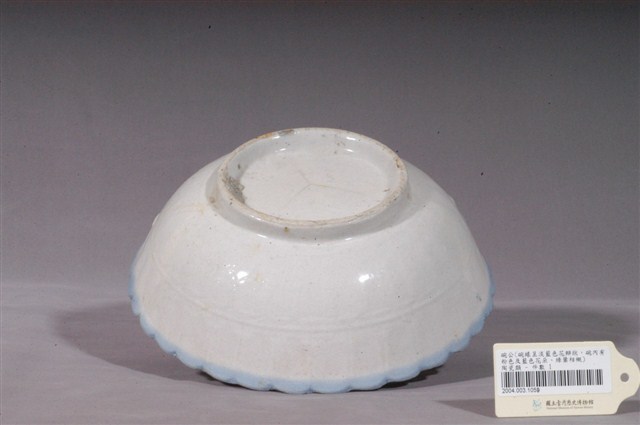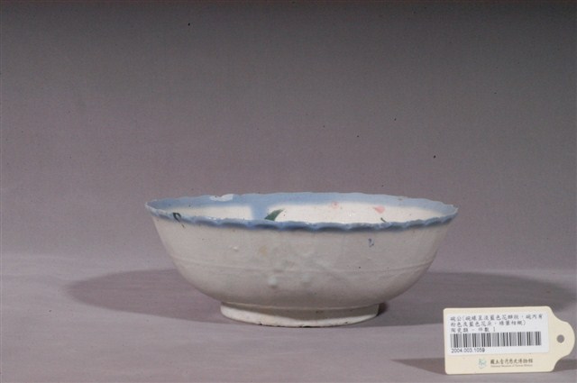 1.手繪青花粉紅彩花卉紋花口碗高溫燒製,並以模具成形。圓唇,敞口,弧壁,大圈足,圈足露胎,胎色白皙,胎質細膩無雜質,略有窯沙沾黏。全器施白釉,呈色帶暖色調,器表略有氣孔。口沿施一道鈷藍釉並作向外開展的波浪花口狀,釉色呈色清淡。外壁腹中間印一道弦紋,沿著弦紋延伸出縱向的稜脊,但紋路較淺不易辨識。碗內的構圖採由上而的俯瞰視角,主要的飾於碗心繪兩朵盛開的花卉,一粉一藍,並於四周增添枝葉及花苞等,使觀者視線更加集中於花卉之上。用筆活潑灑脫,不拘小節。紋飾以粉紅釉及鈷藍釉為主要表現,輔以墨綠釉,整體配色清新雅致。