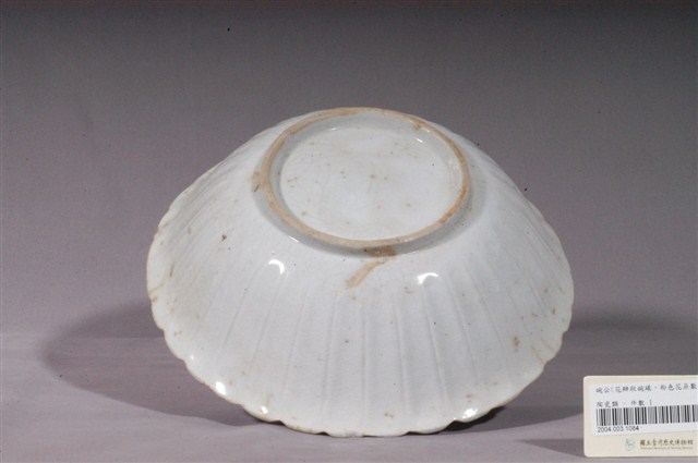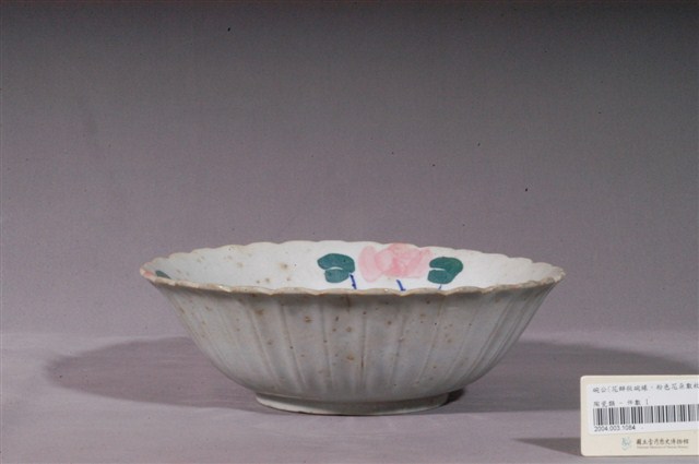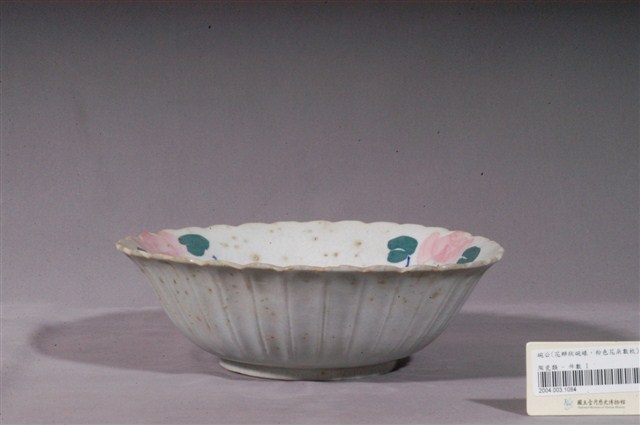 1.彩繪花卉紋花形碗以模具成形,高溫燒製,圓唇,敞口,弧壁,圓腹,碗底較淺且寬,大圈足,圈足露胎,胎色白中帶黃,胎質細。全器施白釉,呈色帶灰,釉面多處因高溫燒造導致的變色,器表有氣孔。口沿作向外開展的波浪花口狀,碗外壁素面無紋,僅以模具印出長條狀的花瓣稜脊。主要紋飾以碗內的圖案為主,以藍、黛綠、粉紅等釉料描繪花朵葉片的結組,以重複的四組構圖填滿碗心。筆法隨性,構圖飽滿。2.此種大碗是戰後常見的家用瓷器,屬於六零年代左右在臺灣北部燒製的瓷器。選用的裝飾紋樣多以花卉、山水景色、動物紋樣為主。尤其以花卉圖案所帶有的吉祥寓意而最受歡迎。