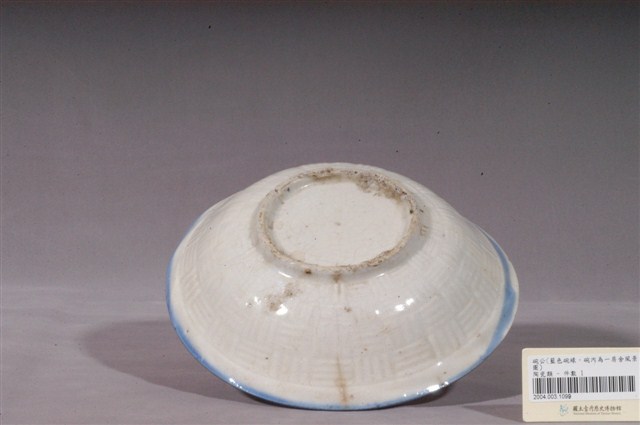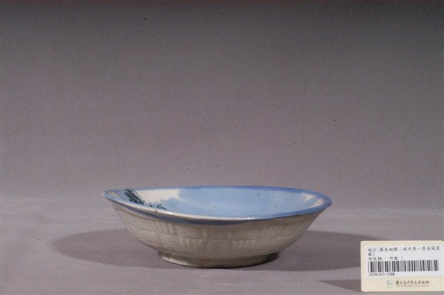 彩繪山水景緻花形碗以模具成形且高溫燒製而成。侈口,弧壁,淺腹,碗形因燒製而略有變形。大圈足,圈足露胎,胎色略帶灰,胎質略為粗糙。圈足因刮釉因此留下凹凸不平的痕跡,圈足底較不平整,且有窯沙沾黏。全器施白釉,呈色帶暖色調,釉面光潔,器表略有氣孔、開片紋路及裂痕。口沿施一道鈷藍釉,器外壁印有橫向線條及直向線條交錯的編織紋路,增添外壁質地的層次感。主要紋飾以碗內壁的圖案為主,以深淺的鈷藍釉、淺黃褐釉等為主要色調,描繪湖水、遠山以及岸邊人家景緻。紋樣的整體構圖簡潔,用筆謹慎,小屋及漁船的造形充滿童趣,且描繪諸多細節