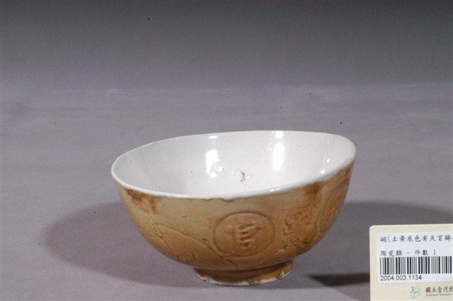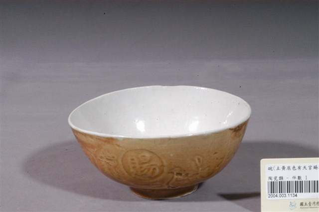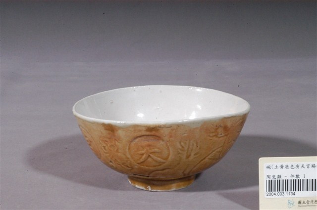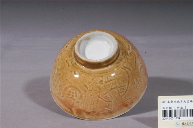 1.黃釉天官賜福印紋瓷碗,敞口,圓唇,圓腹下收,具矮圈足。碗內壁師白釉,素面無紋;外壁則刻印天、官、賜、福四字,文字間以著官服官帽之天官像與其他傳統吉祥圖案穿插,近圈足處印有一圈回紋。碗外壁自口沿至圈足施黃釉,圈足內底呈白色無落款。2.相傳農曆正月十五日上元節時,為天官下降賜福人間,而傳統戲曲當中亦有「天官賜福」之戲曲劇目,敘述賜福天官奉玉帝旨意,與祿、壽二星及五路財神同往人間降福的故事。臺灣傳統吉祥圖繪亦有引此典故之圖案,天官頭戴如意翅丞相帽,五綹長髯,身穿繡龍紅袍,扎玉帶,懷抱如意,通常伴隨蝙蝠圖案,有「福自天上來」之寓意,此類神仙人物圖紋,多用於生命禮俗生誕的祝頌。
