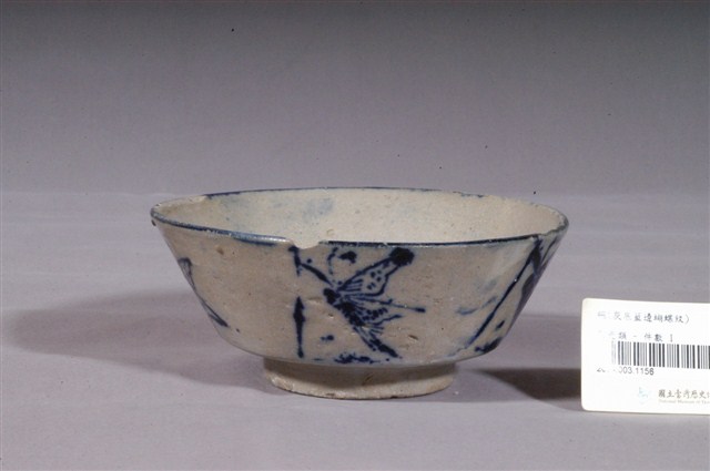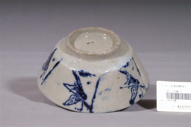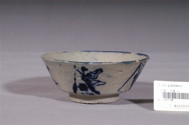 1.白釉藍邊蝴蝶印紋瓷碗,敞口,圓唇,斜直壁下斂至圈足,圈足露胎。全器施白釉,釉色偏灰,不均勻。口沿處與內壁底部各裝飾有一道青花弦紋;外壁以藍彩豎紋隔開,其間以模具沾染鈷藍染料印出蝴蝶圖案,蝴蝶振翅而飛,體態秀美,動作輕靈,形神皆備,洋溢著清新自然的趣味。2. 蝴蝶又稱「蛺蝶」,因深具美感成為藝術上受人喜愛的題材,也時常被應用在民俗藝術中做為器物、織繡、傢具的紋飾。其形象多以工筆之法描繪,強調以深入細緻的觀察作為描繪蝴蝶的根據,可以說是歷代藝術家與匠人共同秉持的原則。