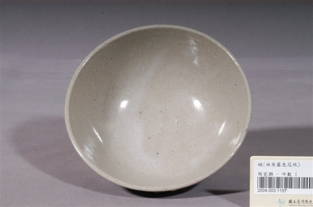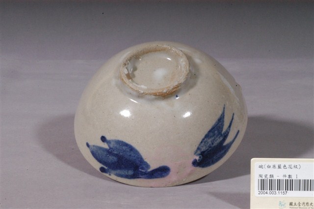 1.白釉紅花藍葉彩繪紋瓷碗,敞口,圓唇,圓腹下收接矮圈足。全器施白釉,釉色偏灰,不均勻;內壁素面無紋;外壁則以彩繪勾勒出藍葉粉紅花圖案,葉片肥厚清晰,花朵的輪廓則較為模糊,整體風格簡約質樸;圈足底刮釉露胎,內底呈白色無落款。2.花卉是最常見的器物紋飾之一。粉紅彩色料,其引進臺灣比釉下青花鈷料年代略晚,但推測日治時期已經開始使用,以粉紅彩花朵加以青花枝葉做搭配是民窯產品經常見到的紋飾。日治時代至戰後初期,陶瓷工廠彩繪的工作通常由女工來負責,這些沒有受過職前訓練的女工每人專畫一部份,並負責不同的色彩。這種情形就好像生產線上的分工一樣,多人共同將一種工作完成。